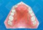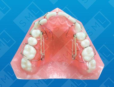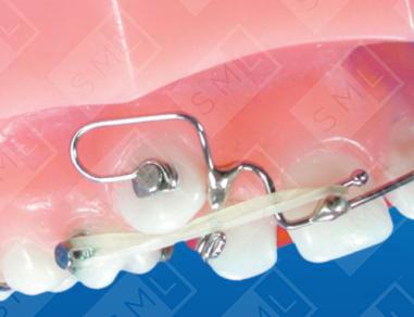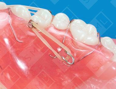 It was once very difficult to effect rotation of a molar or bicuspid using a removable device. The Combination Fixed-Removable Appliance has solved the problem. Direct bond buttons can be placed on just those teeth needing rotation, with hooks for elastics placed wherever they are needed on the removable appliance. Using a mirror, the patient can easily learn to hook up the elastics. Note: Well-designed finger springs can also be added to afford other needed corrections. In this case, a combination finger spring/direct bond button is used on the right cuspid to aid in its eruption and distal positioning as the first bicuspid is rotated.