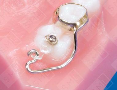 Chain elastic is used between the hook and the button to provide the distal force needed to distalize the molar. Note: Always send an opposing cast to evaluate if there is sufficient occlusal clearance for this appliance.