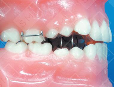 After correction of a patient’s Class II skeletal relationship, this appliance is used as a “reminder” to help the patient function in the forward position during initial retention. Lingual loops have been added to keep the tongue from inhibiting bite closure in the bicuspid region.