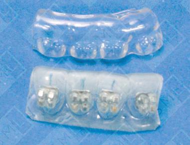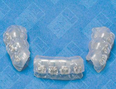 Some clinicians prefer a dual-tray system. With this system, a second hard tray is designed to fit over the flexible tray that holds the brackets. Immediately after placing the soft tray, the hard tray is placed directly over it. A cotton roll is then placed over the top of the hard tray and the patient is instructed to close carefully ( but firmly). This pressure holds the brackets snugly in place until the bonding process is complete. Note: When using a transfer tray technique, please specify type of brackets, where they are to be placed, and which tray system you prefer.