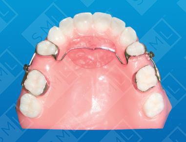 This appliance works in much the same way as the CD Distalizer. However, the design has been modified with the guide wires soldered to the first bicuspids (rather than using the vertical tube assembly to attach them to the bicuspids). Advantages: superior strength and added patient comfort -- attachments to the bicuspids are smooth and reduced in overall bulk. Although this design requires all four bands to be seated at once, this is typically not a problem. Appliance shown depicts the force module necessary to distalize #14 -- and use of the Gurin lock to maintain the already distalized #3. Note: Gurin Locks and open coil spring provide the necessary distalizing force to the molars.