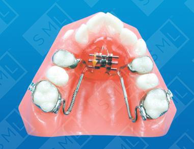 The Haas Suture-Expanding Appliance utilizes acrylic to support the screw and add stability. Haas believed that more bodily movement and less tipping occurred when palatal coverage was provided. Thus, the acrylic closely contacts the palatal mucosa and forces are generated not only against the teeth but also against the soft and hard palatal tissues. In this design, the Haas Expansion Appliance is modified by adding a force component to distal-drive the molars. Sliding lingual bars are attached to the molars via horizontal sheaths and compressed nickel titanium coil spring is packed along the bar. Note: Bands may be custom fit or pre-formed bands may be selected and sent with the prescription. Because this appliance employs four bands for retention, seating may present challenges. To overcome these challenges, we recommend the following:
