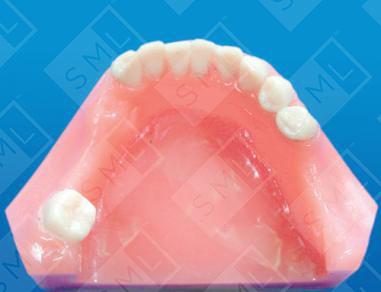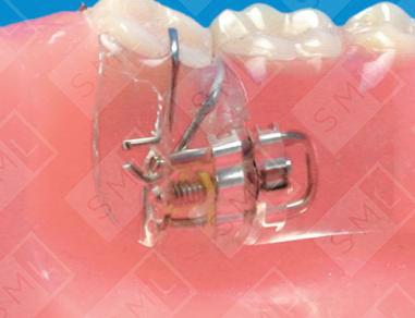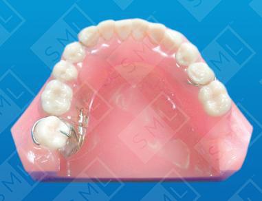 There are times when the fixed appliance approach to molar uprighting is either inappropriate or not possible. Sometimes patients do not have enough teeth to use as an anchor or the stabilizing teeth are periodontally involved. A removable design allows you to use the soft tissue, teeth, and the appliance to form an anchor unit. A temporary partial can be designed which incorporates a spring or an expansion screw to accomplish the desired tooth movement. Retention and anchorage are accomplished by using two to three clasps and by having excellent tissue adaptation. This design is especially useful on adult patients with 12-year molars tipped mesially. Although not shown in this example, a labial bow is often used to prevent flaring of the anterior teeth. Note - When using removable appliances that have an expansion screw, have your patient activate the appliance one turn per week. This is equivalent to 1mm of movement per month.