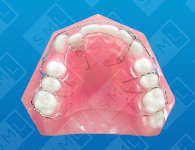 This is another design using finger springs to accomplish a variety of objectives. It is important to provide extra retention (in the form of “C” clasps soldered to the labial wire) when moving anterior teeth. To increase retention, a small composite button can be placed on the buccal -- just occlusal to the “C” clasp -- to create a retentive undercut. In situations where the mesial of the cuspid is not well exposed, the use of a bonded button or bracket will provide a positive contact point for the spring. Maximum stability is necessary to keep the appliance fully seated when activating the finger springs. Remember, it is recommended to activate no more than two springs at any one time. Activating more than two tends to compromise overall appliance retention, slowing down treatment time.