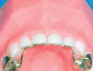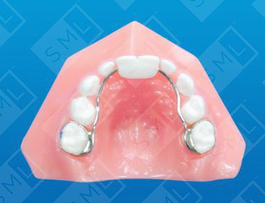 This patient-pleasing fixed appliance can accommodate up to four primary replacement teeth attached to a maxillary lingual arch. Each tooth is individually reinforced to prevent breakage, which can be a problem with this design. Placing rest seats and bonding rests into place will prevent the patient from bending or breaking the appliance. Note: As with all bridges and partials, opposing models and a bite registration are necessary for proper construction.