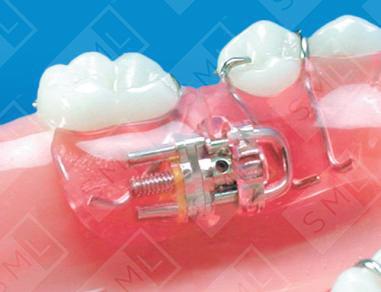 Early loss of primary teeth can allow a first molar to drift mesially and block the eruption of the bicuspids. The Removable Space Regainer uses an expansion screw to distal drive the molar, regaining the space needed for the eruption of the bicuspid. Adjustments are made 1/4 turn once each week (with wrench provided). There is no occlusal rest on the first permanent molar. This will allow the molar to upright as it moves distally. Note: When distalizing a first molar, it is important to take an x-ray of the second molar to make sure distalization will not cause its impaction. If retention is a concern...when using “C” Clasps (shown), consider the use of bonded composite ledges on the buccal of the clasped molars.