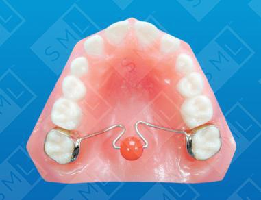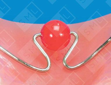 Commonly used in conjunction with tongue loops, this myofunctional device is used to retrain proper tongue position. Patient cooperation is generally not required. The appliance evokes a spontaneous reaction to play with the spinner and thus position the dorsum of the tongue against the soft palate. Note: Many practitioners incorporate this type of myofunctional therapy into their fixed orthodontic treatment. When this is the case, lingual sheaths are often used to maintain this appliance so that the bands do not need to be replaced when tongue therapy is complete.