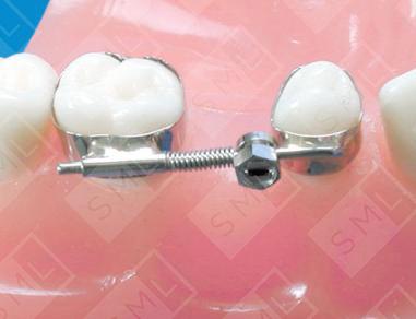 This appliance uses a nickel titanium coil spring -- activated by an adjustable Gurin Lock -- to regain space without tipping or rotating the teeth. The amount of reciprocal movement of the molar distally and the bicuspid mesially will be effected by the proximity of the adjacent teeth. In order to restrict the movement of one of the abutment teeth, it is necessary to add additional anchorage. Using a jackscrew with labial/lingual arch wires, will accomplish this. A small dab of premixed cold-cure acrylic may also be applied to the threads behind the second nut to further ensure that the screw maintains its force and does not back up. Activating the Gurin Lock is easily accomplished with a special box wrench (available from SML).