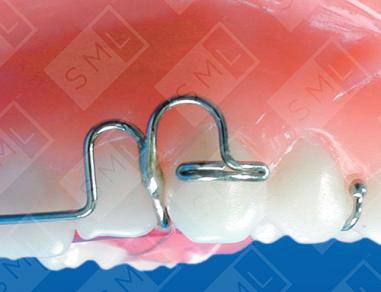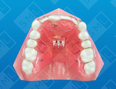 When upper anteriors are lingually positioned, the upper cuspids are often blocked out of the arch form. To gain room for the cuspids, the anteriors must first be moved back into their normal position. This design employs the use of a single expansion screw to uniformly torque the four incisors labially. A labial bow is placed from lateral to lateral to aid in appliance retention and to provide an attachment point for the T-springs that will be used to move the cuspids back into the arch form. As with all appliances, sequencing the movements is important. The incisors must be moved to gain space prior to activating the T-springs. Note: The labial bow is carefully bent so that the distal crossover point will not interfere with your ability to reposition the cuspid.